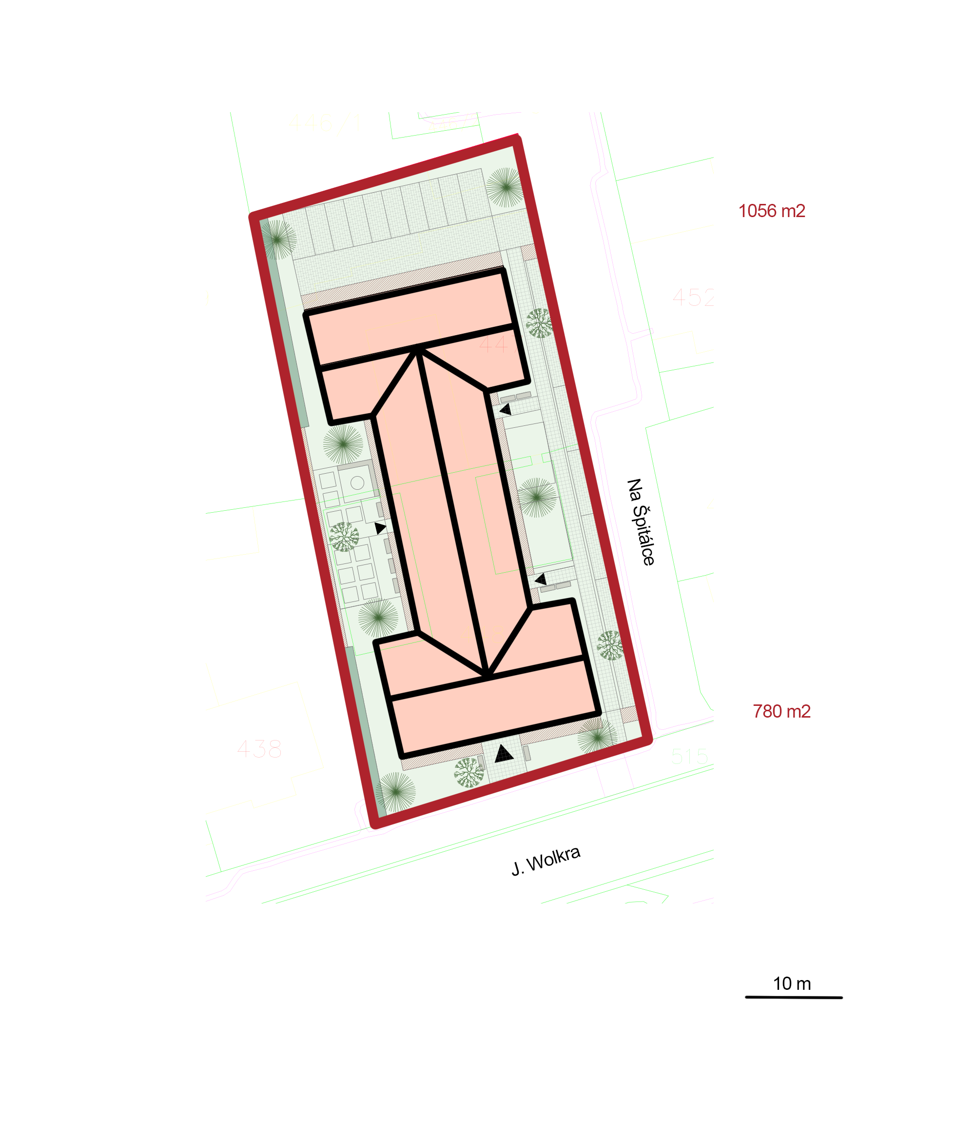 Součástí je reprezentativní vstupní prostor z hlavní ulice J. Wolkra, parková plocha s dětským hřištěm z boční ulice Na Špitálce, relaxační a komunitní zahrada se záhony v západní části a v zadní části parkovací stání.
